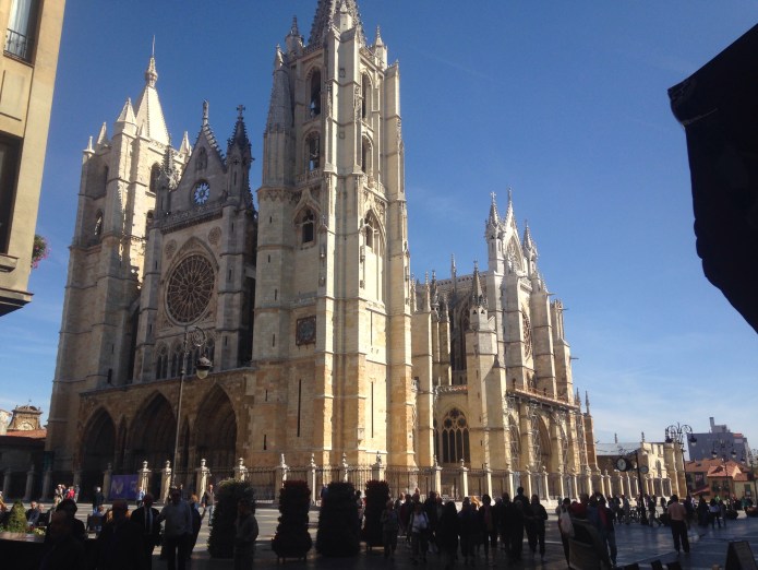 •   It is interesting to me how an event or phrase or experience taken out of context lacks the profundity of meaning due to the lack of connection with the emotions of the moment. I find myself visiting today the town of Leon and her many architectural treasures. I have been here before. Yes it was 35 years ago when Jean and I dragged young Amanda about the north of Spain to see what Amanda called at the time “more old churches”. ( She was only 5). But to walk nearly 300 miles on the Camino and then enter the cathedral in Leon is a whole different thing. I was blessed today with an early morning fog which made for cool walking and then after checking in to the albergue, the full sun and blue sky making it possible to appreciate the finest stained glass windows in the world. It was a whole different emotion.