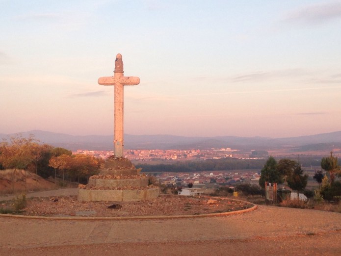 I rose early as in my custom and started walking in the dark at 6. Covered the 26 km past Astorga and on to Santa Catalina de Somoza. Astorga has a magnificent cathedral and a building known as the bishops house designed by Gaudi of Barcelona fame. Astorga sits on a hill surrounded by hills. As I crested the top of the last hill at 8 something, the sun broke over my shoulder to light up the city and the cross that overlooks it. This is the scene I captured.