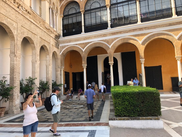 It will be impossible to include all the photos of Sevilla. There are so many treasures. We walked the old city in 110 degree heat to focus on the principle locations in world history. Situated miles inland along the Guadalquivir River, this spot has been occupied for all of human history. It is the launching place for Magellan and Columbus as well as the port that received all the gold and silver from the new world. It is also a center of art boasting names like Surburban, Velazquez, The Barber of Seville, Carmen, and modern film like Lawrence of Arabia, Star Wars, and even Game of Thrones.