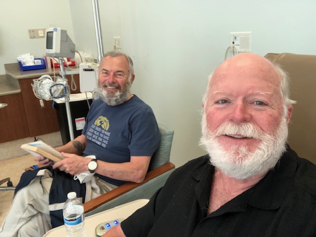 I then entered a phase where I would have infusions every two weeks of the standard cancer chemotherapy “cocktail” of three drugs. They are Dacarbazine, Vinblastine, and Doxorubicib (DVD). These were to be every two weeks and they occurred on 29 March, 12 April, 26 April, 10 May, 25 May, 7 June, 21 June, and 6 July. These are the scary drugs that require the infusion nurses to don a sort of hazmat suit and call over another nurse to assist in making sure that all is right. The nurses were always professional and took great care to make sure that I was comfortable and getting all that I needed. The side effects of these drugs were an ordeal and will be for just about anyone. It is over these five months that I had my most difficult time. I had difficulty sleeping, I was constipated, light headed, and lost my hair and my beard of 25 years. The chemotherapy drugs attack cells that rapidly reproduce like cancer but also, those in your stomach and mouth, your skin, and your hair.) Since the chemotherapy reduces your white blood cell count, any spike in temperature over 100 is extremely dangerous and I was instructed to go immediately to the Emergency Room. This happened to me four times like clockwork four days after infusions in April, May and June. On 14 June, I was hospitalized for intravenous fluids and antibiotics. Early on, I also suffered from a rash, an allergic reaction to the chemo or combination of medications. We were able to isolate the offending drugs after a few weeks of trying and the rash cleared up.