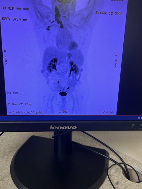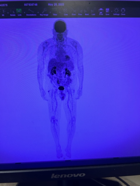 On 25 May, I had a mid term PET Scan to determine our progress. It showed NO VISIBLE SIGNS OF CANCER. (See the scan below). This was thrilling news but the doctors reported that they would have to continue the chemotherapy since the cancer could be hiding in bone marrow or organs where it would not be visible. I was disappointed to learn that I would have to continue for several more months (well into 2024). Alas, at my 6 July meeting with the medical team, I was informed that the team had consulted with the doctor/author of the protocol and since I was doing so well (my bloodwork has been excellent), that they were going to eliminate two months of my chemotherapy (four infusions of the DVD). I would then have four final infusions of BV starting on 20 July. The knowledge of being cancer free and having an end date to my treatments does wonders for your attitude. I am thrilled.