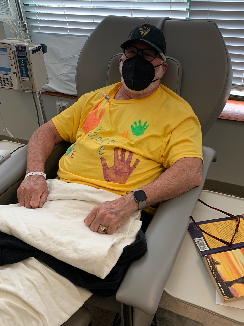 On 7 February, I met with the team at the Hollings Cancer Center and was counselled about the fact that I was stage 3 . (See the scan above. Note the dark lymph nodes on my neck) I was also informed that this should not concern me since Hodgkin’s Lymphoma was curable especially with this particular protocol of a combination of drugs. On 17 February, I had my first infusion. The treatments started ay 7:00 AM where they accessed the port to take samples for blood work that was amazingly comprehensive. This was followed by a meeting with the doctor and his team at 8:00, and on to the infusion nurse. They started me with three drugs that were referred to as Pre-Chemo drugs. These are designed to assist me in handling the side effects of the chemotherapy drugs. They generally consist of an anti-nausea drug, a steroid to boost your energy level, and an anti-viral drug. The first two infusions I had (two infusions 2 or 3 weeks apart are called one cycle) were Brentuximab Vendotin (BV). This is known as a targeting drug that specifically attacks Hodgkin’s Lymphoma. The infusion process was about a three hour ordeal. I had company, a snack, and plenty to read. I was warned to dress appropriately as three hours of pumping fluids into you in an air conditioned room can make you quite cold. There are warm blankets available. I also have learned that you can wheel the pole where the drugs are hanging into the men’s room without much problem. This was important for a man my age. My BV infusions were on 17 February and 9 March. Picture below is of my first infusion wearing a shirt with the hand prints of all four grandchildren, 19, 14, 4, 1nd 1).