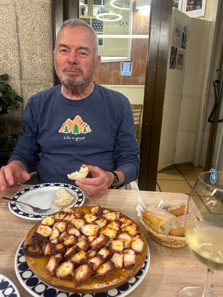 After a shower and a quick nap, we went out to explore Vigo and search for food. Fortunately, that is the easiest task in Spain as we came across about 9 restaurants in the first 3 blocks and we ate in 3 of them. two quick tapas while we waited for the kitchens to open up and one meal of pulpo (octopus). The prices are amazingly low. At two tapas places we each had a glass of wine and a snack for less than 7 Euros. I think I’d like to live here. See pictures