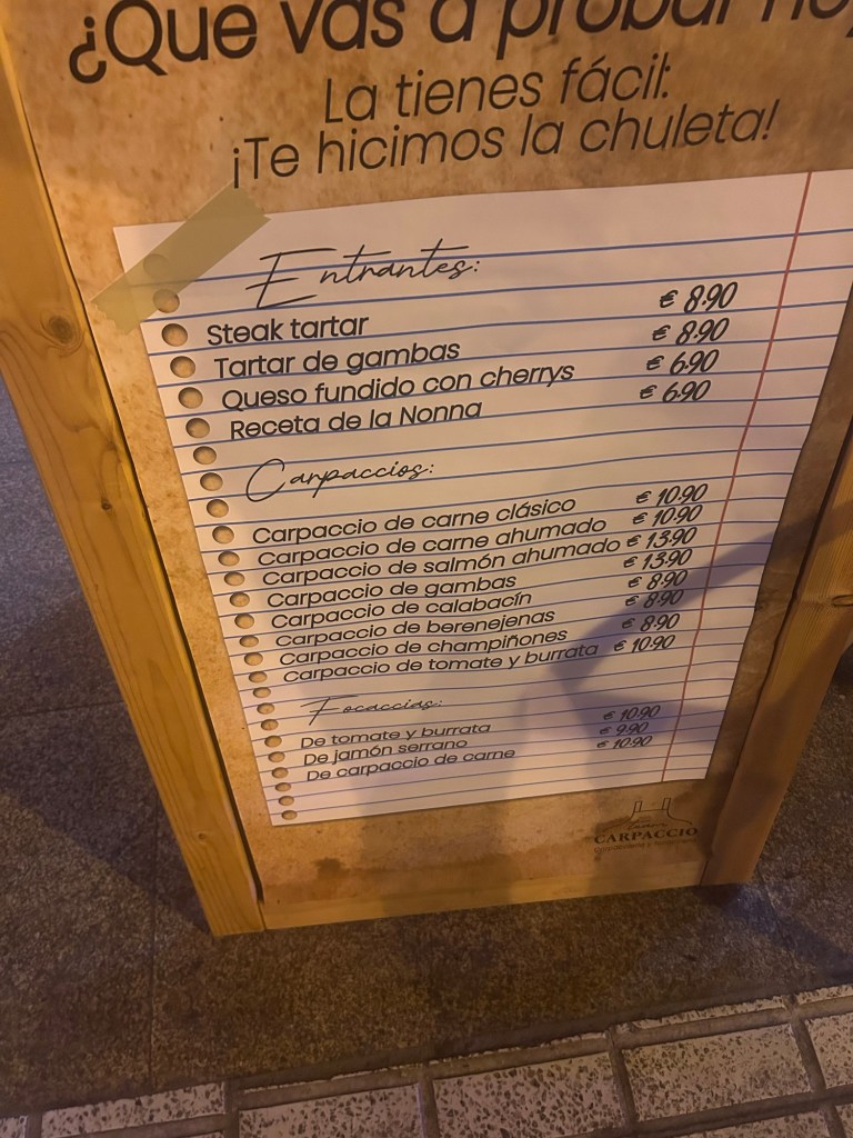 Pulpo ready to eatIn concourse B. Why are these men smiling?Happy pilgrim Choices of carpaccio
