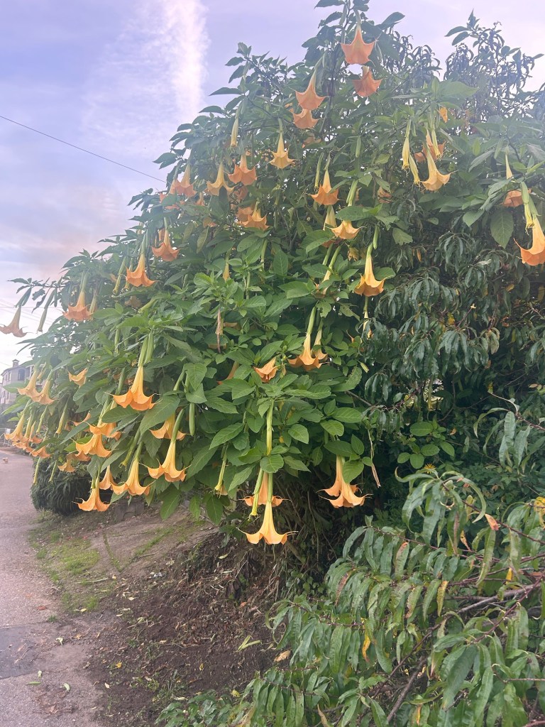 Waterfall on the trail empties into the Ria feeding the musclesThe trail through the Vigo suburbs Trumpet vine tree?