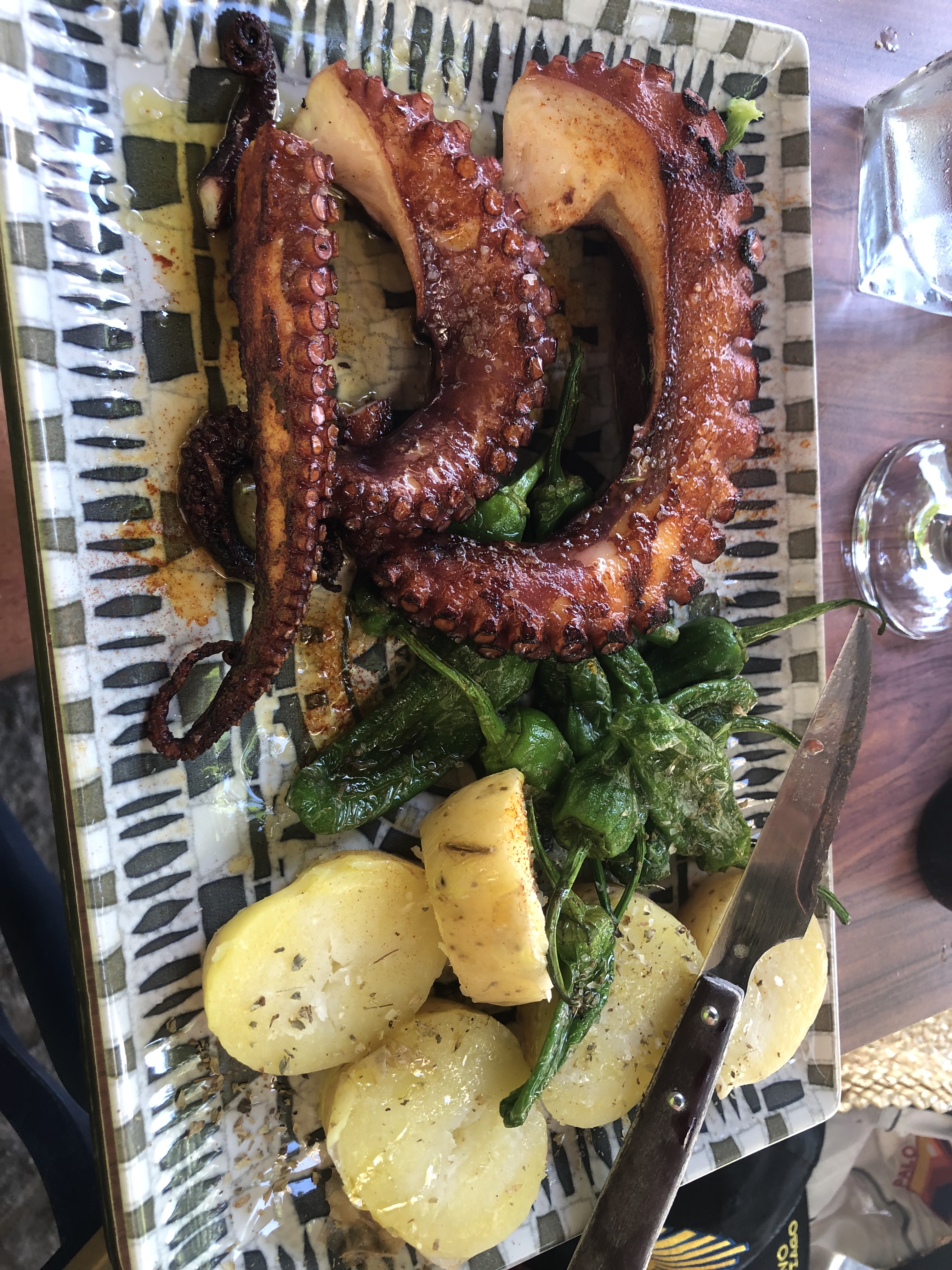 We completed our time in Madrid with a return to the incredible Mercado de San Miguel. This was a derelict open air neighborhood market that Spain poured lots of renovations into and today is the premiere tapas market in the world. Where it excels in variety and volume, it exceeds in quality. Absolutely any tapa you have ever heard of or tasted is here and many others you could never have imagined. If you don’t know about tapas, it comes from the verb tapar (to cover). It’s origins were small snacks served in a piece of bread used to cover your wine glass in the Middle Ages when the flies were not under control. Natural competition between restaurants made this humble beginning an art form of competitive delicious and creative small plates that you are served free with your glass of wine or beer. The result is a culture of grazing your way about Spanish towns with friends and family while you sample your favorite small plates. Tonight we had mini pizza, five different types of fish, an assortment of olives, and a plate of shrimp and calamari. We ended with cookies.