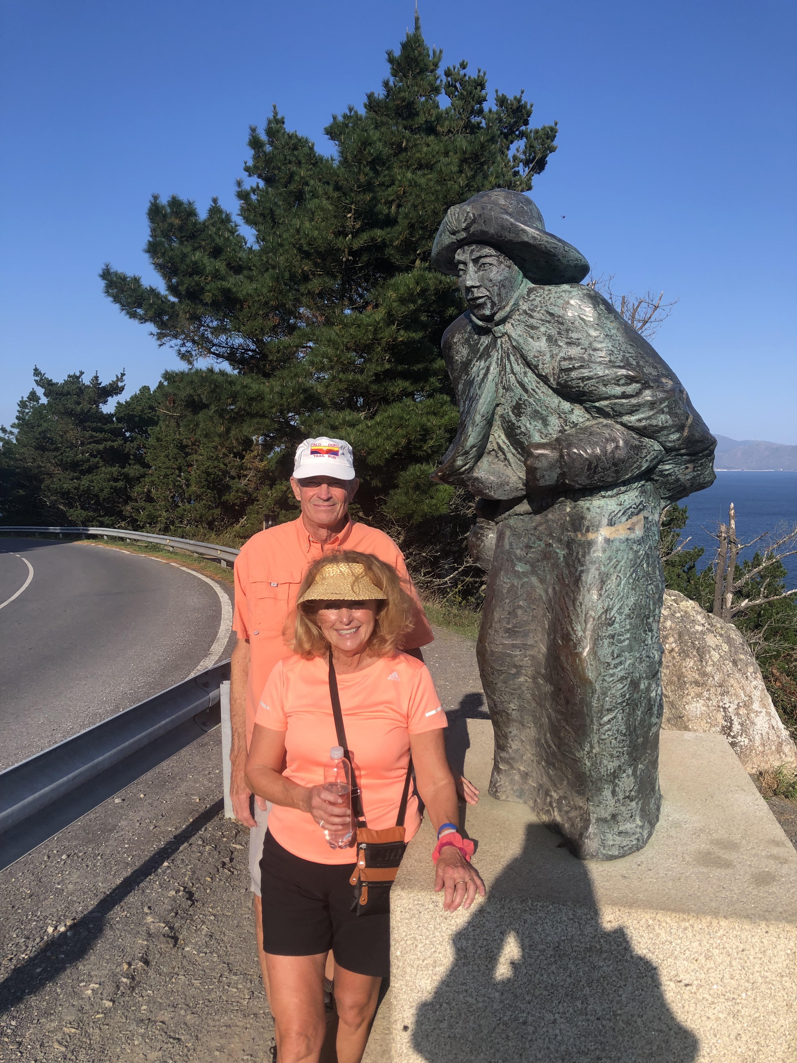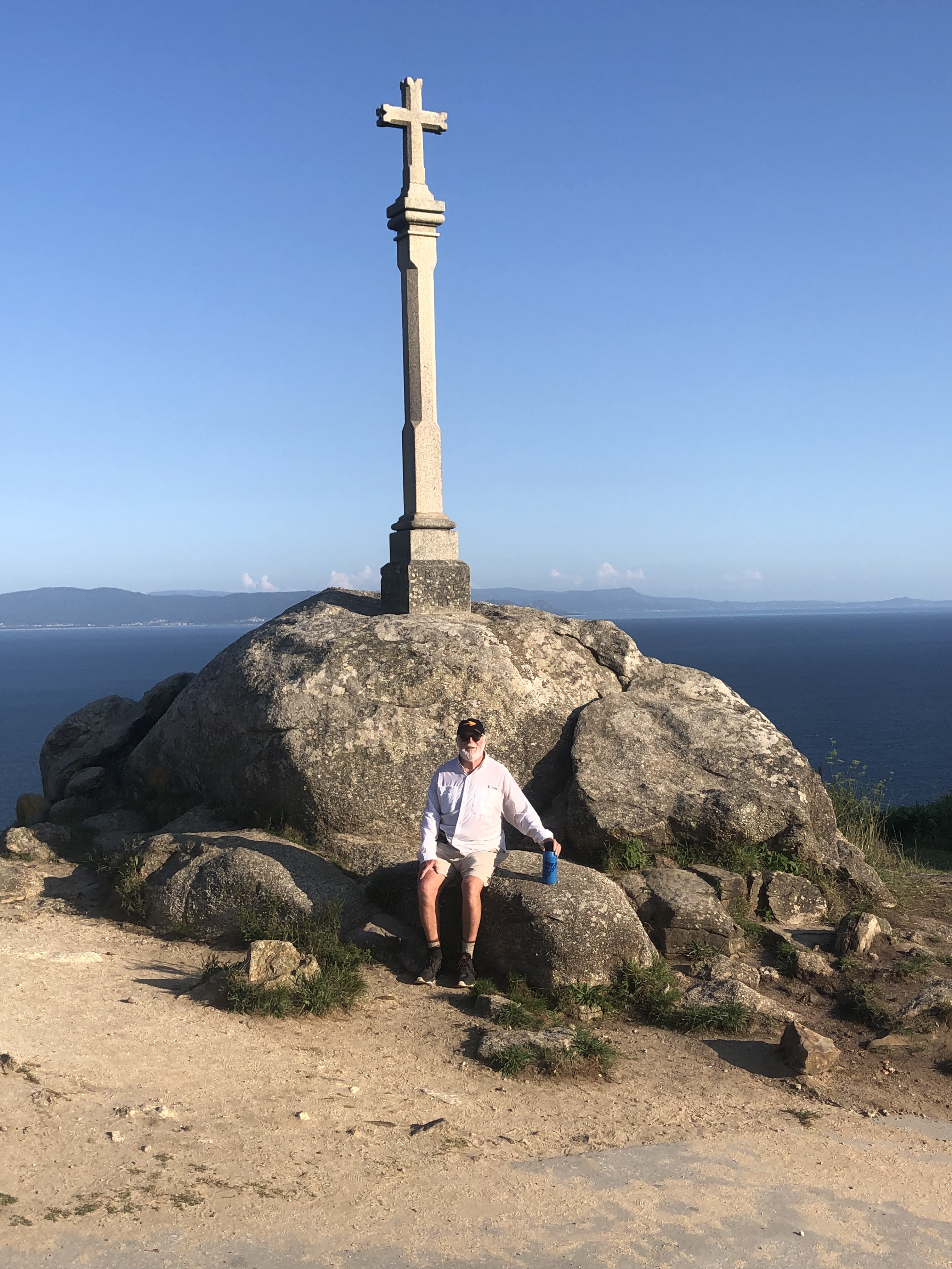 We finished our walk into Fisterra this afternoon but that leaves 3 Km left to get to the lighthouse (El Faro). So this evening we did the walk up the final hill to stand on Km 0.000 and take a few more pictures. Not to do so would be like departing the Opera before the proverbial Fat Lady Sings. Photos are of this evening’s trecking up to the end of Cape Fisterra which has been through history called Costa de la Morte or the coast of death. This is true due to the large number of shipwrecks here and I certainly hope is has nothing to do with pilgrims who walked there.