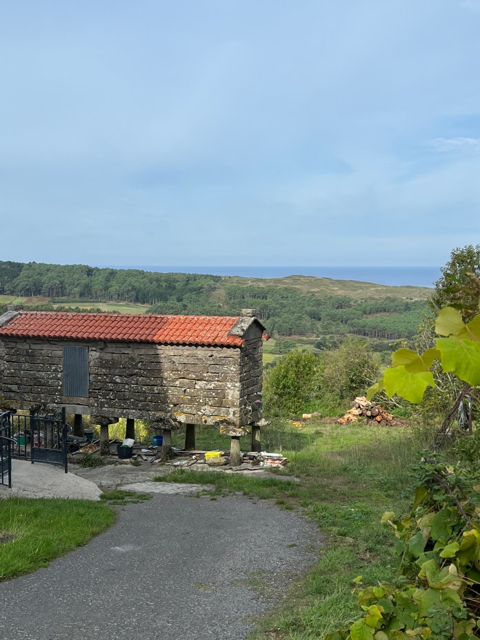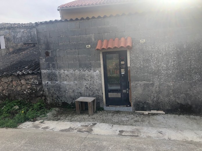 Last night in Finisterre was a classic Albergue experience as we had to endure both a snorer and a girl with a cough. They were still sound asleep when Merci, Scott, and I departed at sunrise. Since it is a Saturday morning, finding a place for breakfast that was open was a challenge. We waited a few minutes, had our toast and coffee, and started our climb out of Finisterre. We were fortunate to get the breakfast we had because after walking 13 km up and down coastal forests and farms, the first chance we had to replenish fluids or take a break, we arrived at our destination. The only exception was an enterprising farmer who had cut a hole in the street side of one of his stone barns where he placed a vending machine. It seemed so out of place in this rural setting. Also pictured are our scenes of the ocean from our walk.